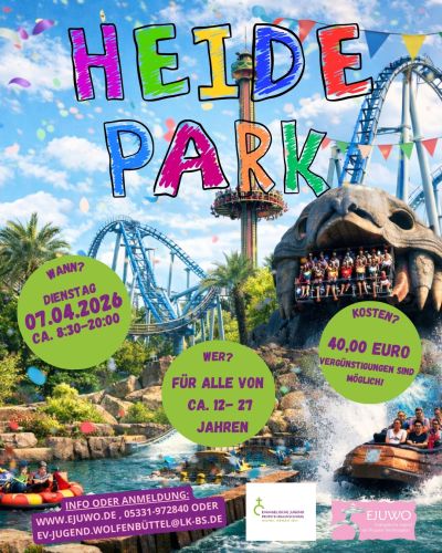 Desert Race, Flug der Dämonen, Krake, Grottenblitz und Big Loop. Oder einfach nur Dampf Karussell, Drachengrotte, Ghostbusters 5D oder Indy-Blitz... Nervenkitzel, kribbeln im Bauch und Glücksgefühl sind garantiert dabei! Die beiden Ev. Jugenden Braunschweig und Wolfenbüttel fahren, weil es so schön war, wieder zusammen in den Heide Park, um einen ganz besonderen Tag zu erleben. Du hast Lust mitzukommen? Perfekt! Melde Dich gerne bei uns an. Auch Deine Freunde können gerne mitkommen!